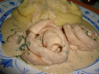 Fica um prato muito agradável, com um molho cremoso a saber suavemente a limão (se abusarmos no dito cujo já não fica tão bom!!) e que eu, pessoalmente, gosto de combinar com puré de batata caseiro, pois acho que casam muito bem!