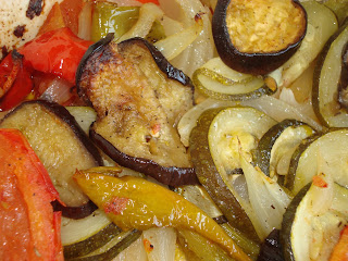 Dispuz os legumes, cortados como referido acima, num tabuleiro de ir ao forno e à mesa, reguei-os com azeite e vinagre, temperei de sal, pimenta e ervas da Provença, envolvi tudo muito bem e levei ao forno durante cerca de 35 minutos, mexendo de vez em quando.
